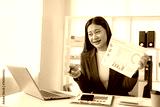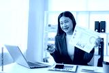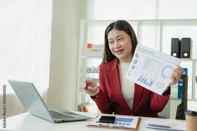 Attractive Asian accountant in suit calculating cash bill of audit and balance sheet working on quarterly report using laptop thinking about project plan. Analyze marketing or financial data online