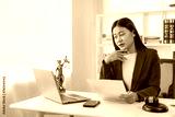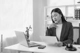 Asian female lawyer working in office or court with hammer and justice pad on table, online legal advice with new laws of real estate business. Law, legal service, advice, justice.