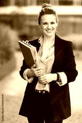 smiling modern business woman near business center