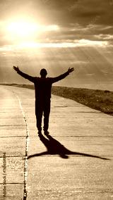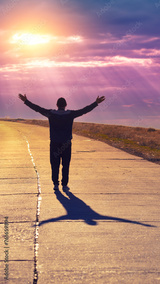 A young man with hands in the air walks along a concrete road and looks at a beautiful orange sunset. Vertical image