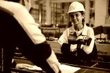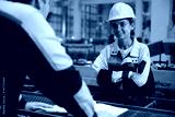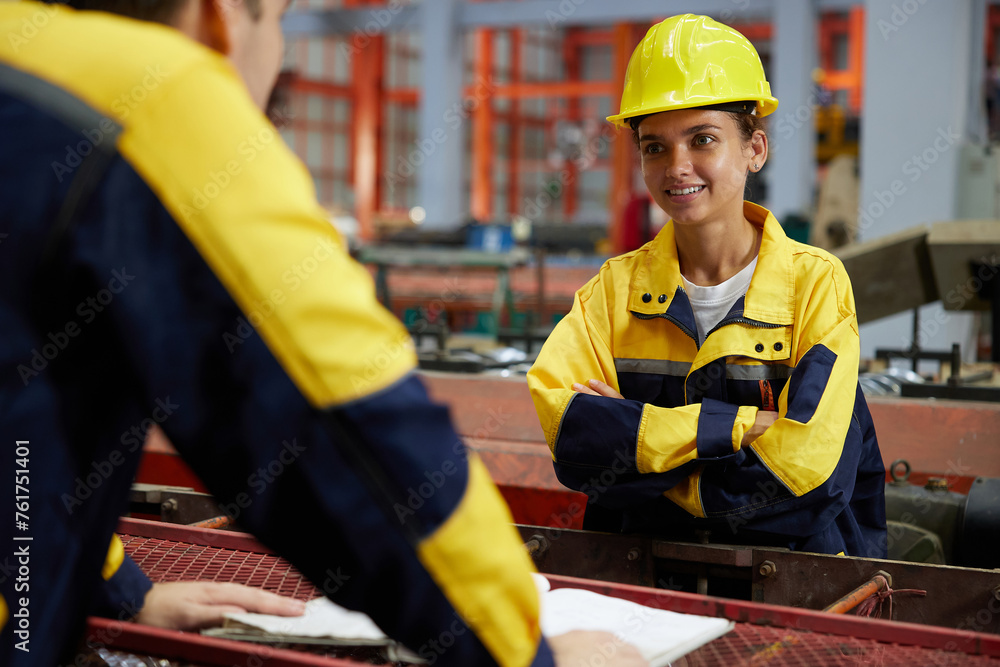 engineer or worker talking and meeting with coworker in the metal sheet factory