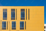 Yellow ventilated facade of building wall with windows and decorative finishes. Fragment of office building. Architectural or building background. Copy space