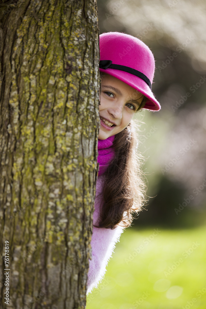 Child peeking behind a tree