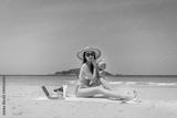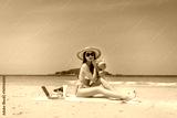 Happy sexy freelance woman wearing bikini sunglasses and beach hat workout relaxed drinking coconut juice with work on laptop computer at beach in summer holidays.