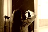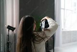 Female Photographer Capturing a Couples Portrait in a Bright Studio Setting