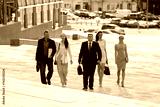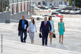 five young attractive business people climb flight of stairs in an urban environment summer day