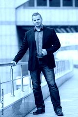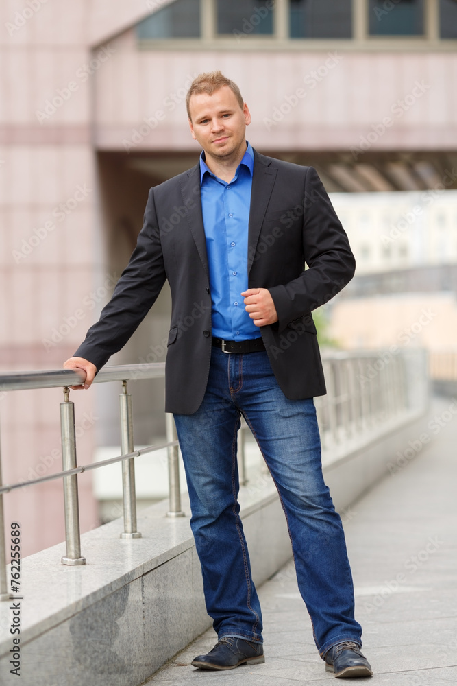 portrait of handsome young businessman in black jacket and jeans walking outdoors