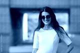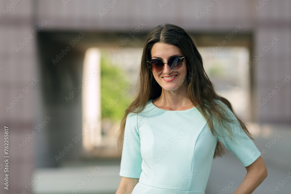 Close-up portrait of beautiful young fashion model in sunglasses posing in city street, smiling and looking in camera
