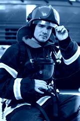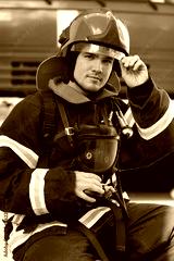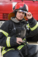 Portrait of fireman wearing fire fighter turnouts and red helmet, hand on visor