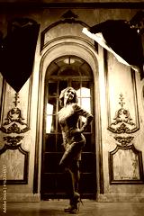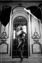 Happy actress in short shiny dress with sequins near the arched windows and studio lighting system in an ancient palace interior