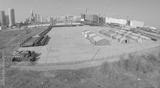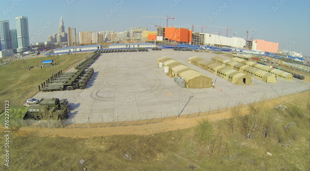 Base with tents and military equipment prepared for Victory Day Parade at spring sunny day, aerial view