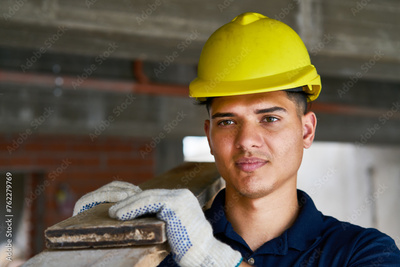 Confident young male carpenter wearing hardhat carrying planks on shoulder at construction site