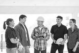 Smiling contractor holding tablet PC discussing with construction team while standing together inside incomplete house