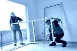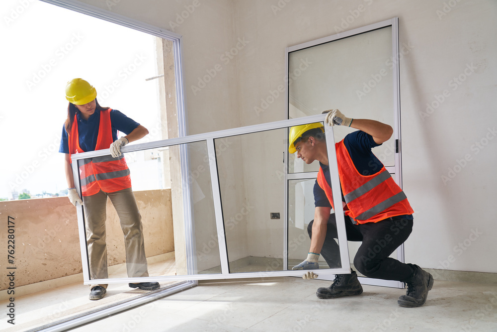 Full length of two carpenters wearing safety vest installing window frame in house construction site