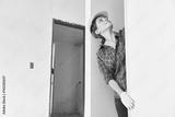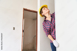 Young female construction worker wearing safety workwear installing door at incomplete house