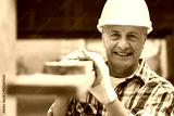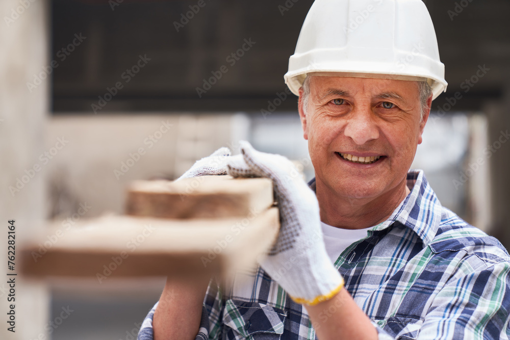 Portrait of senior male worker wearing workwear with planks on shoulder at construction site