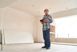 Full length of senior male architect wearing hardhat standing with tablet PC inside incomplete house