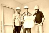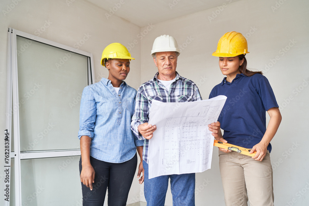 Senior male contractor discussing over blueprint with female construction workers at incomplete house