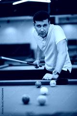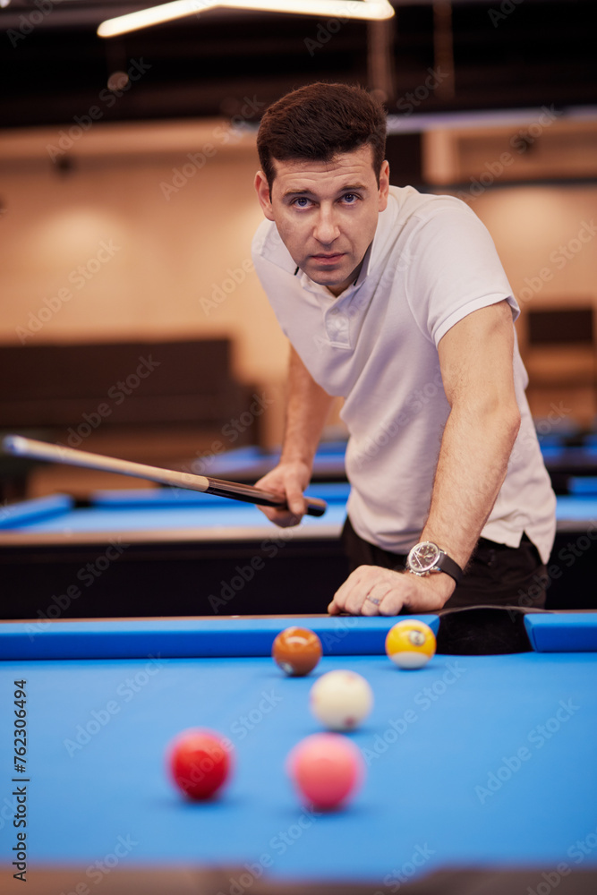 Man in white polo-neck shirt stands with cue stick in hand near pool table in club.