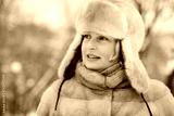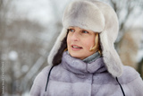 Portrait of smiling woman in fur hat and coat in winter snow-covered park.