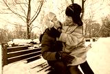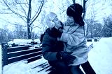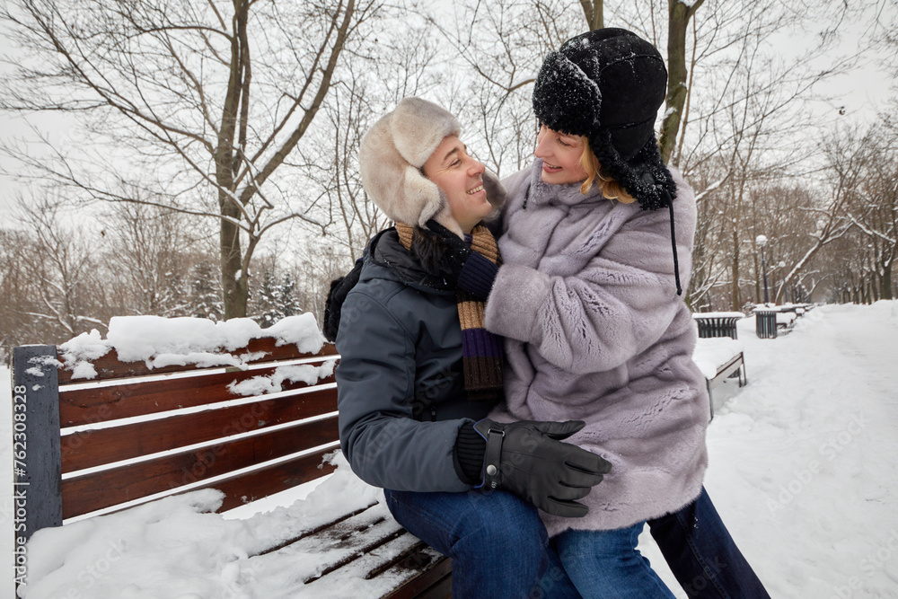 Smiling man and woman sit looking at each other on bench in snowy winter park.