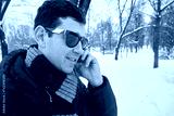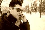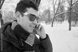 Man in dark sunglasses talks cell phone in snowy winter park.