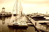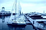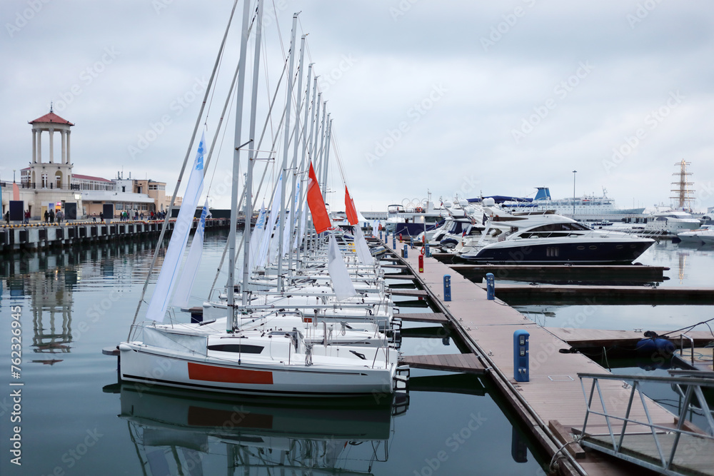 Many white sailboats are near pier in Sochi, Russia in cloudy day