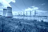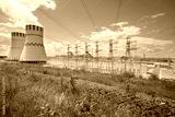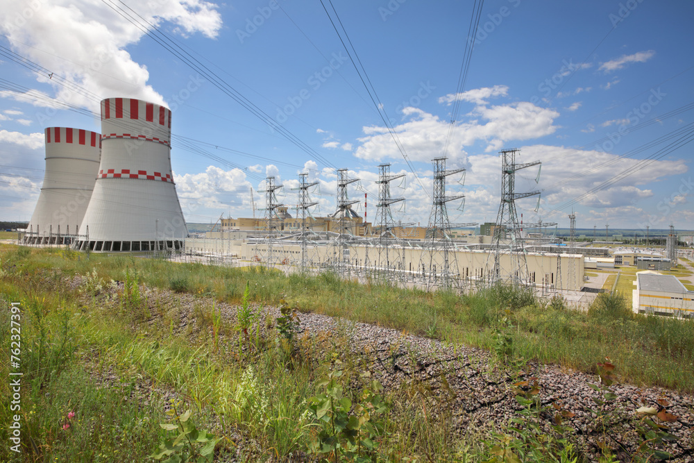 Smoking pipes, poles with wires of atomic thermal power plant at summer day