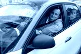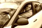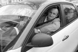 Woman and elderly man, girl fastened with seat belts sit in car, focus on man