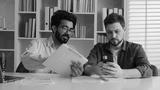 Two businessmen multiracial men co-workers in office Arabian Indian businessman show papers business project on laptop to colleague Caucasian man ignoring addicted mobile phone inefficient teamwork