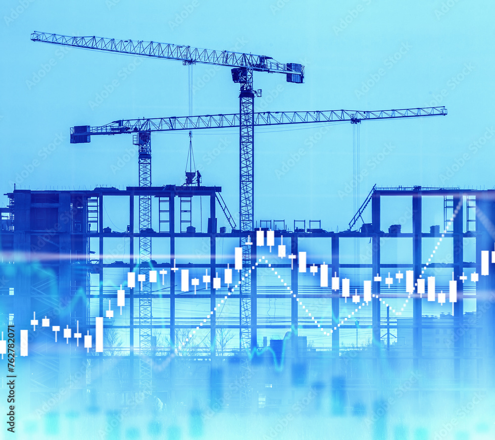 Building business. Devil near house under construction. Financial fluctuations in architectural market. Graph rising prices for new apartments. Tower cranes. Investments in construction industry