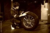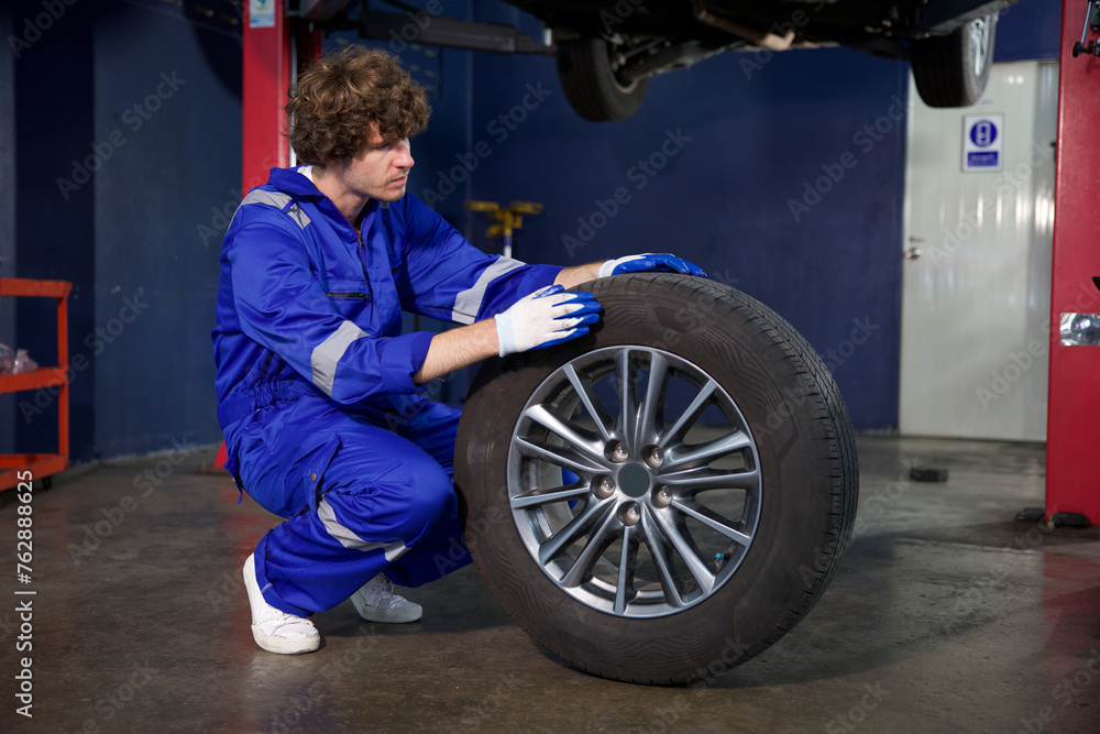 mechanic holding and checking a tire for fixing in garage
