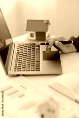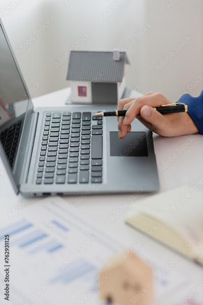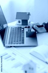 Man in a suit doing property tax calculations using a calculator of a house model