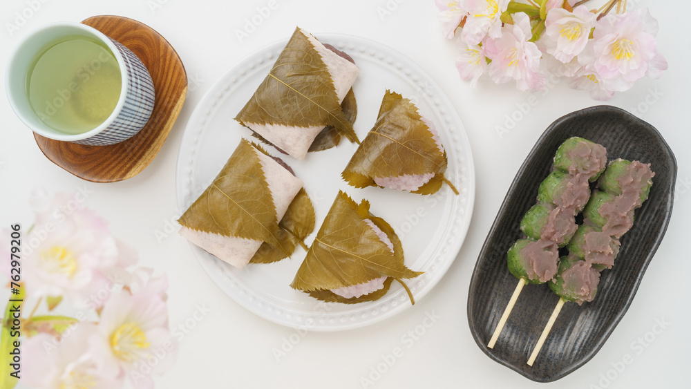 桜と春の和菓子イメージ|桜餅と草団子と緑茶