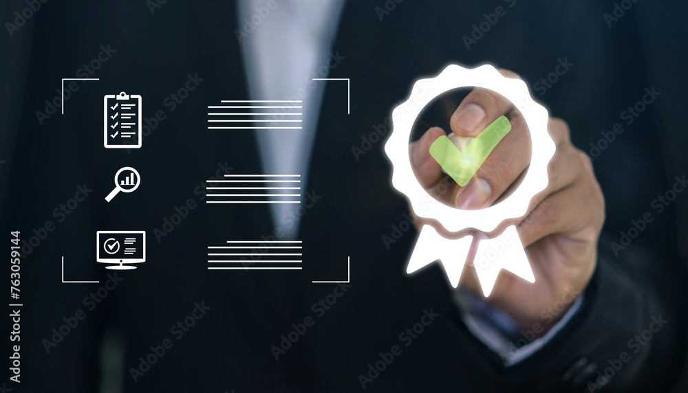 Business hand with the sign of the top service Quality assurance, Guarantee, Standards, ISO certification and standardization concept, online shopping, satisfaction, service experience