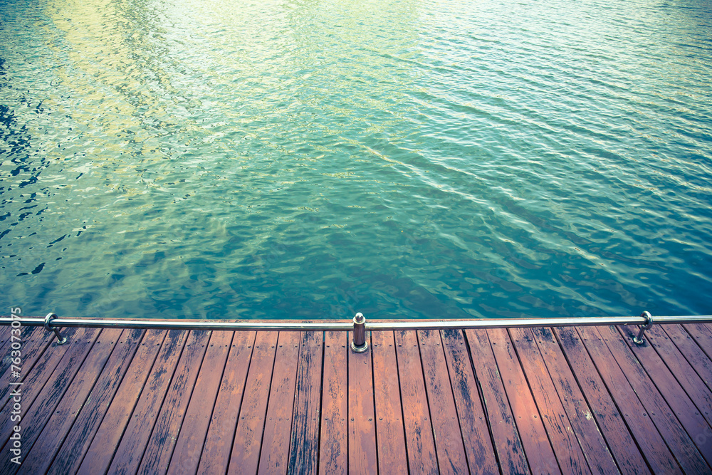 Wood plank for walk with water surface waves background