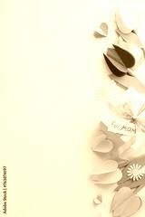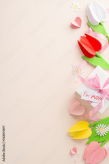 Artful Mother's Day greeting, top view vertical photo of origami tulips, chamomiles, crafted gift box with "for mom" signage, bound with ribbon, paper hearts, subtle confetti on blush beige surface