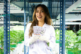 female scientist smiling and holding cash money beside cannabis plants in the greenhouse