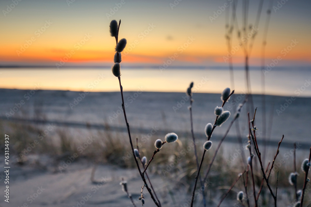 A beautiful sunset on the beach of the Sobieszewo Island at the Baltic Sea at spring. Poland