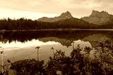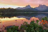 Golden sunset in mountain lake. Two peaks reflected in water. Summer scenery landscape, orange and pink flowers on blank. Travel, touristic destination place. Power of Siberia, Ergaki national park