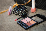Women's accessories: eyeshadow, nail polish, clip hair, handbag
