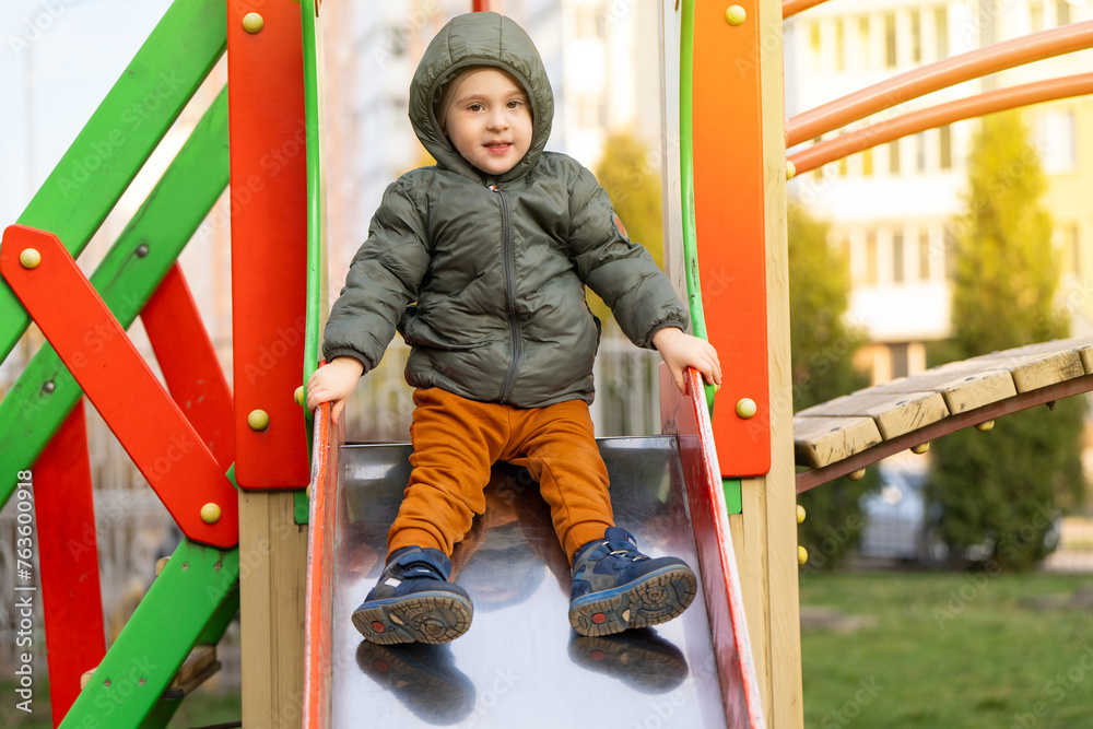 A cute smiling toddler boy of three years rides on a swing in a playground. Children's entertainment. Toddlerhood and childhood