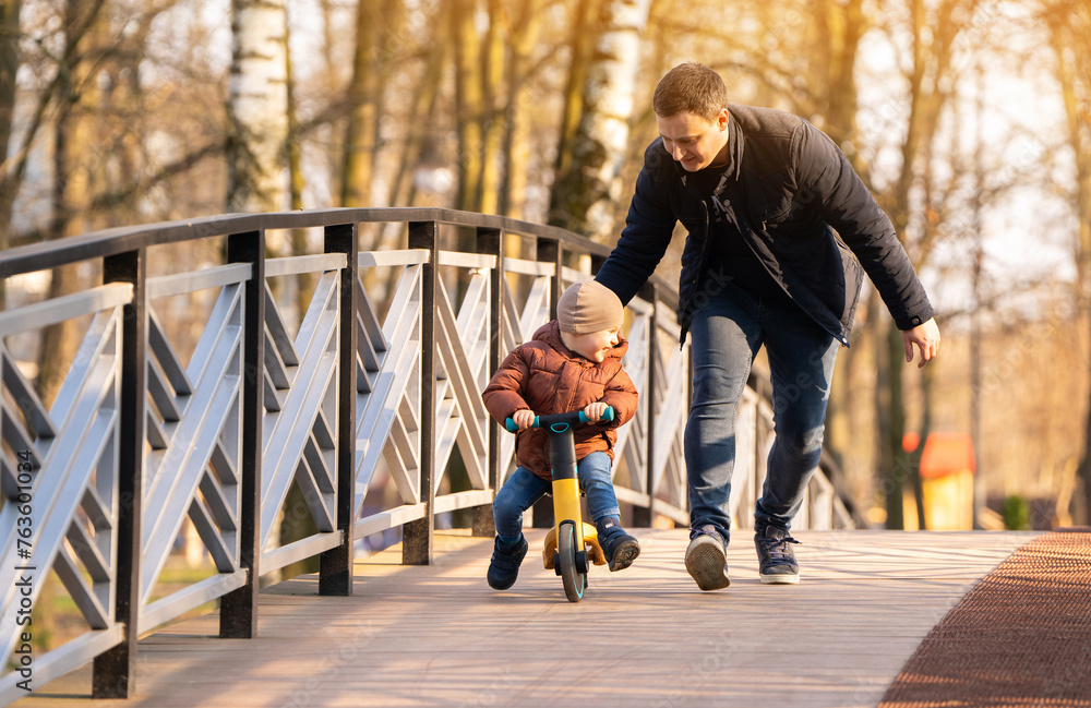 Happy father and son ride a bicycle on a bridge on a sunny day. Having fun together with family. Spending time