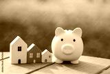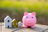 Wooden houses and piggy bank stands outdoors on a sunny day. Real estate and investments in housing concept. Mortgage, loan. Eco-friendly house