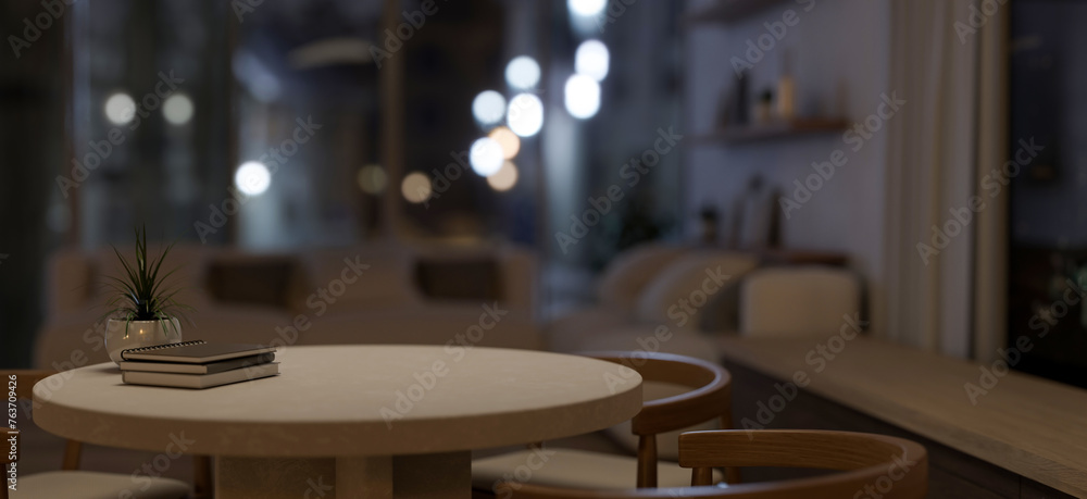 A space for displaying products on a round table in a contemporary and cozy living room at night.