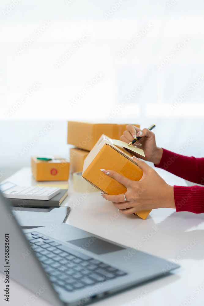 female online store small business owner The seller packs the parcel behind the shipping box. Preparing packages for SME e-commerce delivery service concept. Close-up.