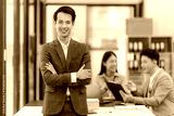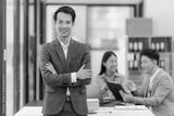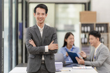 Asian businessman standing with arms crossed and looking at camera Standing in front of a table with co-workers who are meeting to discuss financial investments in the back of the office.