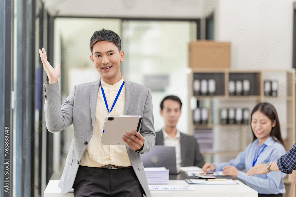 Asian businessman standing with arms crossed and looking at camera Standing in front of a table with co-workers who are meeting to discuss financial investments in the back of the office.
