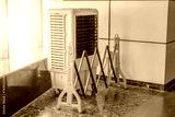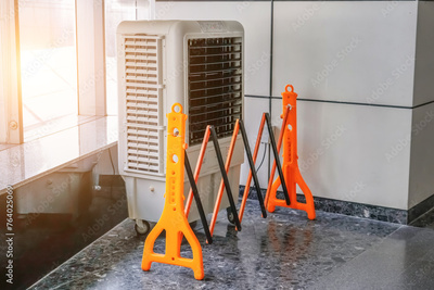 Portable air conditioner or mobile air cooler in modern public place space, fenced with a folding barrier fence