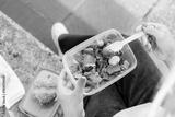 Top view close up lunch box with fresh salad and wooden folk in hand of woman sitting on the bench. Balanced diet lunchbox for weight loss. Healthy eating habits and well-being. Selective focus.